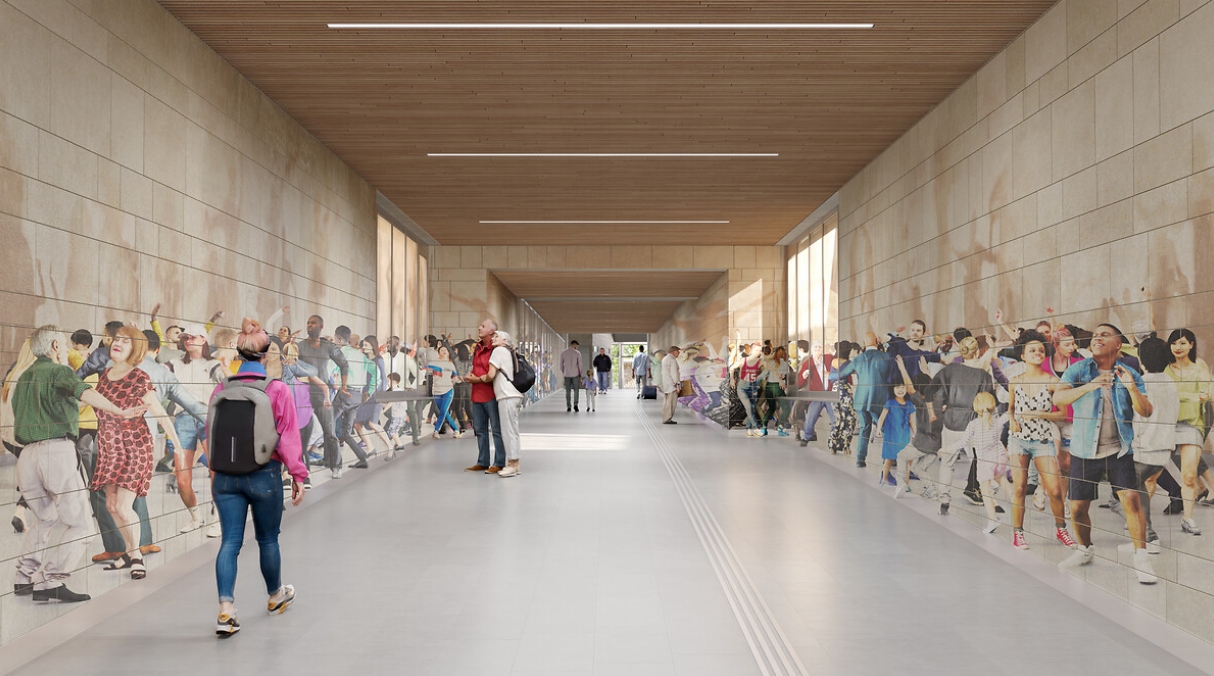 Une grande anamorphose photographique représentant une foule dansante se décline sur les deux parois du couloir, directement imprimée sur le parement en pierre de Bourgogne. Cette composition carnavalesque, qui sera réalisée avec les habitants de la ville de Chelles, élargit l’espace par un effet de trompe-l’œil. Visible dans son entièreté à l’entrée du couloir, l’œuvre s’étire au fur et à mesure de l’avancée du voyageur faisant alors surgir des formes abstraites.