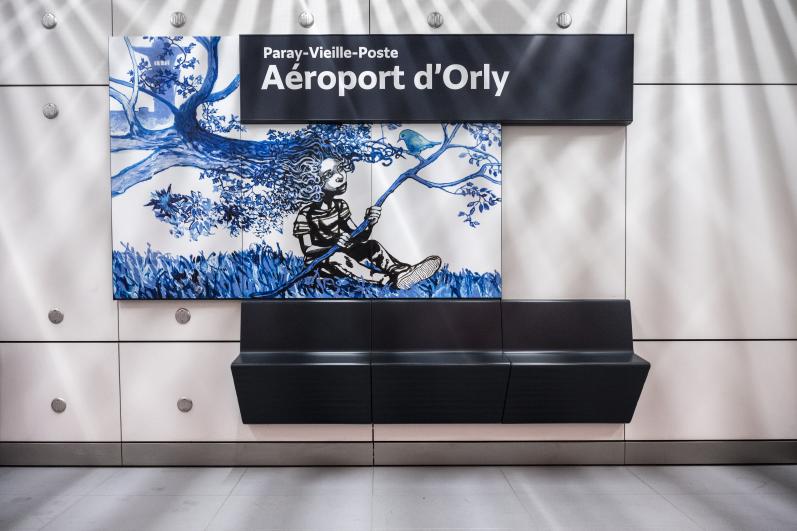 "L’histoire de l’aviation et celle de l’aéroport d’Orly prennent vie à travers un motif qui traverse tous les panneaux des enfants tournés vers leurs rêves." Edmond Baudoin, Illustrateur