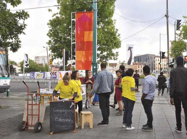 A la Courneuve, l’artiste Malte Martina conçu un dispositif totémique de dix drapeaux implantés autour du périmètre du chantier et une signalétique pointant les initiatives à découvrir dans la ville. Baptisé « Agrafmobile », ce dispositif associe des initiatives locales et des récits d’associations ou d’équipements de la Courneuve.